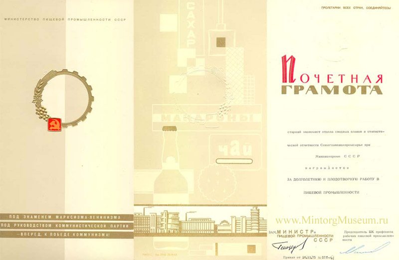 Почётная грамота Союзглавпищепромсырьё Минпищепром СССР, 1975 год