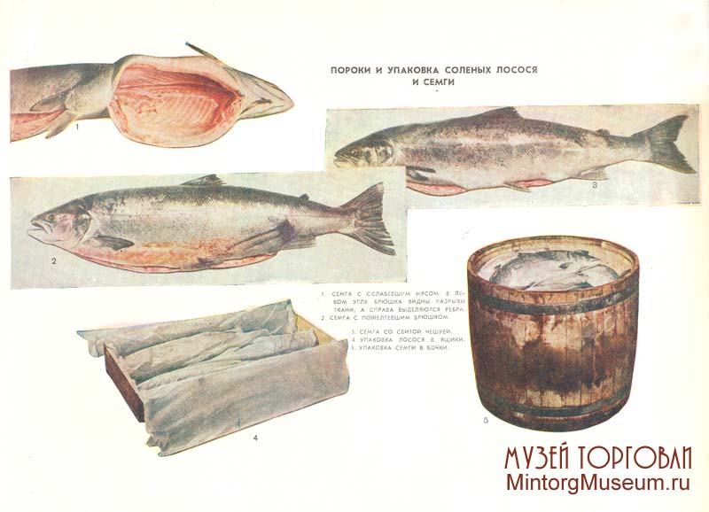 1 - Перевозка и хранение живой рыбы. 1. Жирорыбный вагон (внешний вид); 2. Схема жирорыбного вагона (внутреннее устройство: 1-ванны; 2-насос; 3-труба; 4-форсунки; 5-вентилятор; 6-труба для воздуха); 3. Автоцистерна; 4. Плот с садками для хранения живой рыбы; 5. Выгрузка из садка живой рыбы 2 - Продажа живой рыбы. 1. Аквариум и рабочее место продавца; 2. Вылавливание живой рыбы сачком и перекладывание её в металлический ящик; 3. Перед взвешиванием рыбу завёртывуют в бумагу; 4. Глушение рыбы; 5. Очистка рыбы от чушуи 3 - Ассортимент мороженой рыбы. 1. Осётр; 2. Севрюга; 3. Судак; 4. Сазан; 5. Щука; 6. Навага тихоокеанская; 7. Навага северная 4 - Ассортимент мороженой рыбы. 1. Треска; 2. Пикша; 3. Окунь морской; 4. Сиг глазированный; 5. Брикет из морского окуня; 6. Брикет из трески 5 - Ассортимент мороженой рыбы. 1. Камбала; 2. Ставрида черноморская; 3. Пеламида; 4. Килька, мороженная брикетом в коробке; 5. Карась мелкий; 6. Окунь речной - мелочь 1-й группы; 7. Красноперка - мелочь 2-й группы; 8. Синец (Сопа) - млочь 2-й группы 6 - Ассортимент и упаковка мороженой рыбы. 1. Сырок; 2. Муксун; 3. Упаковка сазана в ящик; 4. Упаковка судака в ящик; 5. Упаковка морского окуня в картонные ящики; 6. Упаковка мелочи в кули; 7. Упаковка рыбы в корзины 12 - Разделка сельдей для посола. 1. Сельдь неразделанная; 2. Сельдь жаброванная; 3. Сельдь зябреная; 4. Сельдь обезглавленная; 5. Сельдь-балычок; 6. Тушка сельди 26 - Ассортимент рыбы горячего копчения. 1. Лещ; 2. Сазан; 3. Угорь; 4. Севрюга; 5. Сом 27 - Ассортимент и упаковка рыбы горячего копчения. 1. Треска; 2. Окунь морской; 3. Горбуша; 4. Салака; 5. Упаковка мелкой рыбы в ящики; 6. Упаковка осетровых в ящики; 7. Драночная коробка для упаковки мелкой рыбы 31 - Ассортимент балычных изделий. 1. Схема разделки рыбы на балык и тешу; 2. Схема разделки белуги на боковники; 3. Копчёнаяспинка белорыбицы; 4. Копчёная спинка нельмы; 5. Копчёная спинка осетра; 6. Копчёные балычные изделия из кеты (спинка без головы, спинка с головой, пласт); 7. Копчёные теши белорыбицы; 8. Копчёный боковник белуги 32 - Определение качества и пороки балыков. 1. Прошупывание спинки; 2. Определение запаха спинки при помощи шпильки; 3. отставание кожи у спинки; 4. Помятость спинки; 5. Разрыв кожи спинки 34 - Разделка спиное осетровых рыб холодного копчения. 1. Удаление кожи со всей спинки; 2. Подрезание кожи по мере продажи покупателей; 3. Нарезка; 4,. Переноска нарезанной спинки на бумагу для взвешивания 40 - Икра зернистая осетровых рыб. 1. Икра белужья баночная; 2. Икра осетровая баночная, взятие пробы костяной ложечкой; 3. Икра севрюжья баночная; 4. Клетка для укладки банок с икрой в бочки; 5. Маркировка бочек; 6. Открытая бочка с банками зернистой икры, засыпанными льдом 41 - Икра паюсная осетровых рыб и зернистая лососевых рыб. 1. Бочки с паюсной икрой ёмкостью 30 и 50 литров; 2. Открытая бочка с паюсной икрой. Пергамент отвёрнут и видна веерообразная заделка полотна; 3. Икра кетовая в жестяной банке; 4. Икра пастеризованная, расфасованная мелкую тару; 5. Икра паюсная в жестяной банке. 42 - Подготовка к продаже и отпуск икры. 1. Банка с зернистой икрой перед вскрытием; 2. Освобождение банки от резинового кольца; 3. Отделение крышки при помощи ножа; 4. Снятие крышки; 5. Вскрытая банка - зеркало икры не повреждено; 6. Начало отпуска икры; 7. Приспособление со льдом для хранения икры на прилавке; 8. Продажа икры лососевых рыб из окорёнка 44 - Кулинарные рыбные изделия. 1. Треска жарена