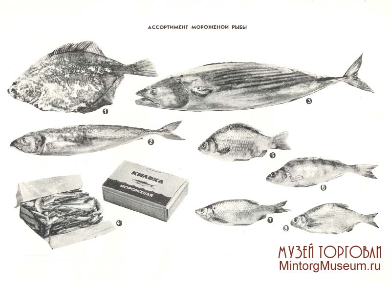 1 - Перевозка и хранение живой рыбы. 1. Жирорыбный вагон (внешний вид); 2. Схема жирорыбного вагона (внутреннее устройство: 1-ванны; 2-насос; 3-труба; 4-форсунки; 5-вентилятор; 6-труба для воздуха); 3. Автоцистерна; 4. Плот с садками для хранения живой рыбы; 5. Выгрузка из садка живой рыбы 2 - Продажа живой рыбы. 1. Аквариум и рабочее место продавца; 2. Вылавливание живой рыбы сачком и перекладывание её в металлический ящик; 3. Перед взвешиванием рыбу завёртывуют в бумагу; 4. Глушение рыбы; 5. Очистка рыбы от чушуи 3 - Ассортимент мороженой рыбы. 1. Осётр; 2. Севрюга; 3. Судак; 4. Сазан; 5. Щука; 6. Навага тихоокеанская; 7. Навага северная 4 - Ассортимент мороженой рыбы. 1. Треска; 2. Пикша; 3. Окунь морской; 4. Сиг глазированный; 5. Брикет из морского окуня; 6. Брикет из трески 5 - Ассортимент мороженой рыбы. 1. Камбала; 2. Ставрида черноморская; 3. Пеламида; 4. Килька, мороженная брикетом в коробке; 5. Карась мелкий; 6. Окунь речной - мелочь 1-й группы; 7. Красноперка - мелочь 2-й группы; 8. Синец (Сопа) - млочь 2-й группы 6 - Ассортимент и упаковка мороженой рыбы. 1. Сырок; 2. Муксун; 3. Упаковка сазана в ящик; 4. Упаковка судака в ящик; 5. Упаковка морского окуня в картонные ящики; 6. Упаковка мелочи в кули; 7. Упаковка рыбы в корзины 12 - Разделка сельдей для посола. 1. Сельдь неразделанная; 2. Сельдь жаброванная; 3. Сельдь зябреная; 4. Сельдь обезглавленная; 5. Сельдь-балычок; 6. Тушка сельди 26 - Ассортимент рыбы горячего копчения. 1. Лещ; 2. Сазан; 3. Угорь; 4. Севрюга; 5. Сом 27 - Ассортимент и упаковка рыбы горячего копчения. 1. Треска; 2. Окунь морской; 3. Горбуша; 4. Салака; 5. Упаковка мелкой рыбы в ящики; 6. Упаковка осетровых в ящики; 7. Драночная коробка для упаковки мелкой рыбы 31 - Ассортимент балычных изделий. 1. Схема разделки рыбы на балык и тешу; 2. Схема разделки белуги на боковники; 3. Копчёнаяспинка белорыбицы; 4. Копчёная спинка нельмы; 5. Копчёная спинка осетра; 6. Копчёные балычные изделия из кеты (спинка без головы, спинка с головой, пласт); 7. Копчёные теши белорыбицы; 8. Копчёный боковник белуги 32 - Определение качества и пороки балыков. 1. Прошупывание спинки; 2. Определение запаха спинки при помощи шпильки; 3. отставание кожи у спинки; 4. Помятость спинки; 5. Разрыв кожи спинки 34 - Разделка спиное осетровых рыб холодного копчения. 1. Удаление кожи со всей спинки; 2. Подрезание кожи по мере продажи покупателей; 3. Нарезка; 4,. Переноска нарезанной спинки на бумагу для взвешивания 40 - Икра зернистая осетровых рыб. 1. Икра белужья баночная; 2. Икра осетровая баночная, взятие пробы костяной ложечкой; 3. Икра севрюжья баночная; 4. Клетка для укладки банок с икрой в бочки; 5. Маркировка бочек; 6. Открытая бочка с банками зернистой икры, засыпанными льдом 41 - Икра паюсная осетровых рыб и зернистая лососевых рыб. 1. Бочки с паюсной икрой ёмкостью 30 и 50 литров; 2. Открытая бочка с паюсной икрой. Пергамент отвёрнут и видна веерообразная заделка полотна; 3. Икра кетовая в жестяной банке; 4. Икра пастеризованная, расфасованная мелкую тару; 5. Икра паюсная в жестяной банке. 42 - Подготовка к продаже и отпуск икры. 1. Банка с зернистой икрой перед вскрытием; 2. Освобождение банки от резинового кольца; 3. Отделение крышки при помощи ножа; 4. Снятие крышки; 5. Вскрытая банка - зеркало икры не повреждено; 6. Начало отпуска икры; 7. Приспособление со льдом для хранения икры на прилавке; 8. Продажа икры лососевых рыб из окорёнка 44 - Кулинарные рыбные изделия. 1. Треска жарена
