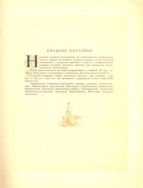 Каталог рассказывает о продукции, выпускавшейся к середине 50-хх годов ХХ века в СССР, где ликеро-водочная промышленность СССР вырабатывала разнообразные ликеры, кремы, наливки, настойки и водки по единой рецептуре, составленной на основе научных исследований и химико-аналитических показателей сырья, полуфабрикатов и готовых изделий. Всю продукцию приготовляли на натуральном растительном сырье.