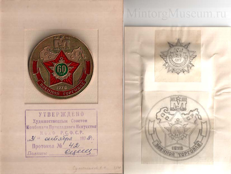Проект настольной медали к 60-летию военной торговли (Главное управление торговли Министерства обороны СССР). Утвержден Художественным советом Комбината прикладного искусства МОХФ РСФСР 31 октября 1978 года. Также видно изображение нагрудного значка, подготовленного к той же юбилейной дате.
