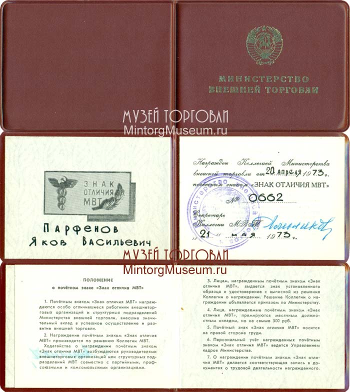 Удостоверение сотрудника Министерства внешней торговли, 1973 год