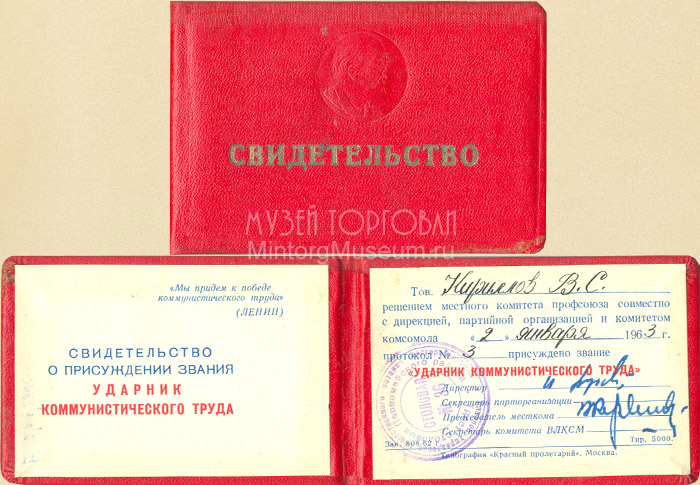 Удостоверение Ударника коммунистического труда, 1963 год (Свидетельство)