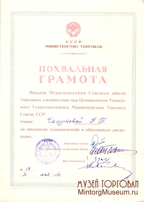 Похвальная грамота Педагогического совета школы Торгового ученичества (ШТУ) при Центральном Универмаге (ЦУ) Главунивермага Министерства торговли СССР за отличную успеваемость и образцовую дисциплину