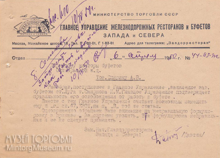 Главдорресторан Запада и Севера, 1950 год