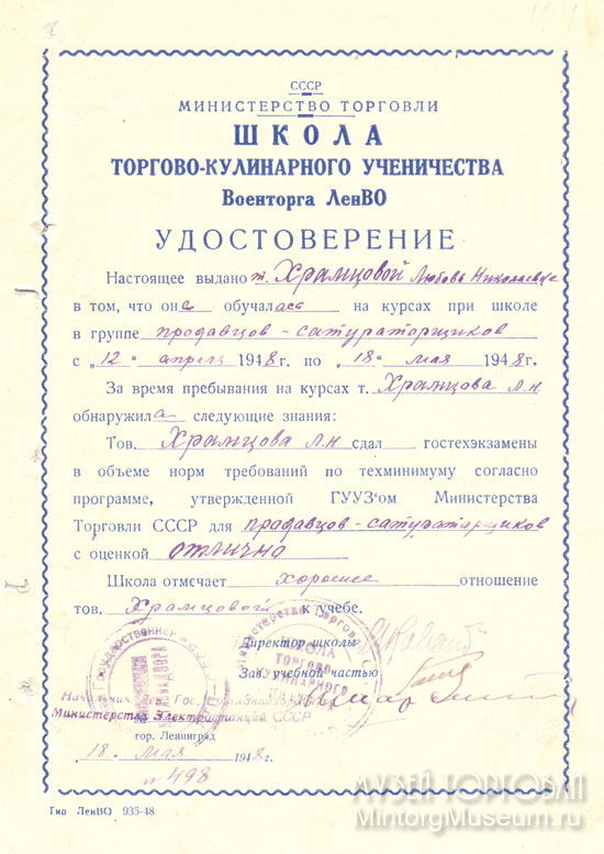 Удостоверение ШТКУ Министерства торговли СССР Военторга Ленинградского Военного Округа, 1948 год.