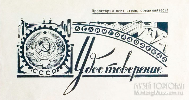 "Шапка" бланка удостоверения Ленинградодежда НКТ СССР(фабрика "Красный парус", г. Ленинград, Петровский остров, Петровский проспект, 5/7), образца 1933 года