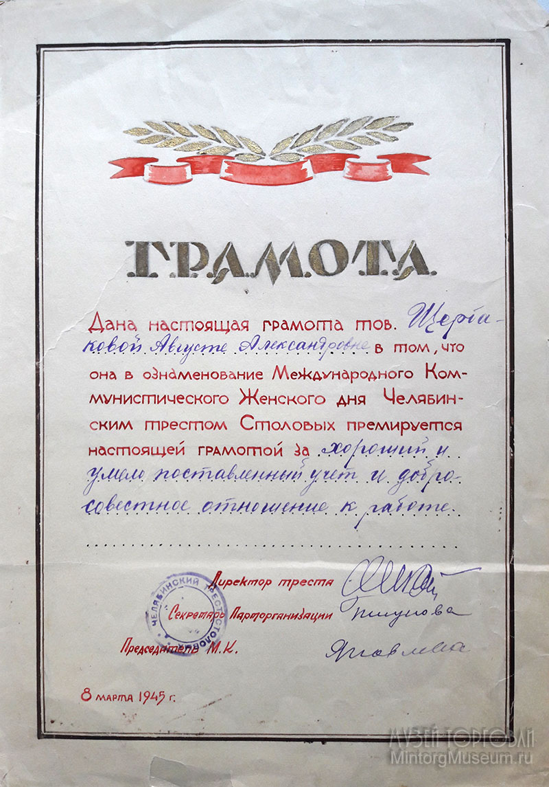Челябинский трест Столовых 8 марта 1945 год