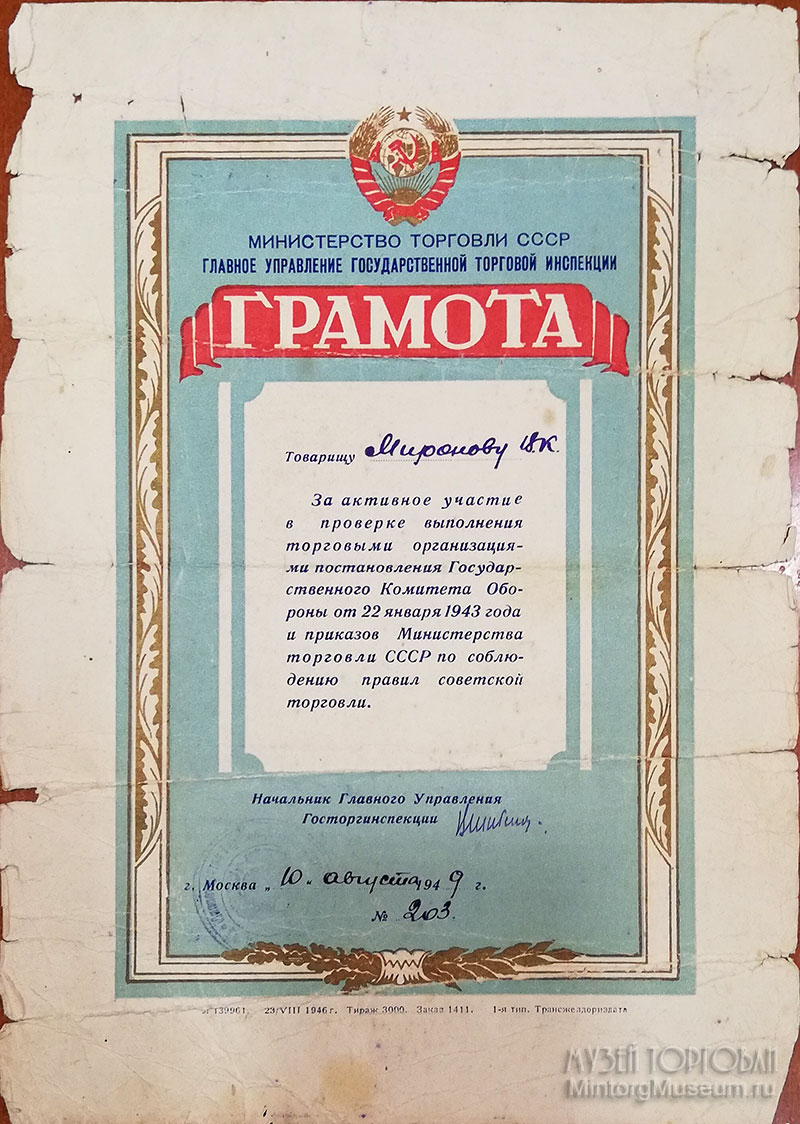 Главное управление Государственной торговой инспекции Министерство торговли СССР 10 августа 1949 г.