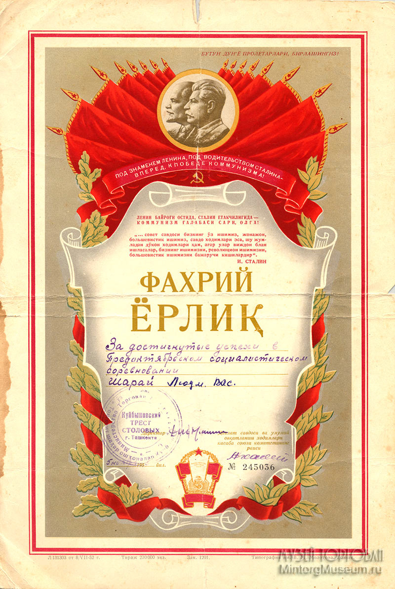 Куйбышевский трест столовый г. Ташкента 5 ноября 1955 год