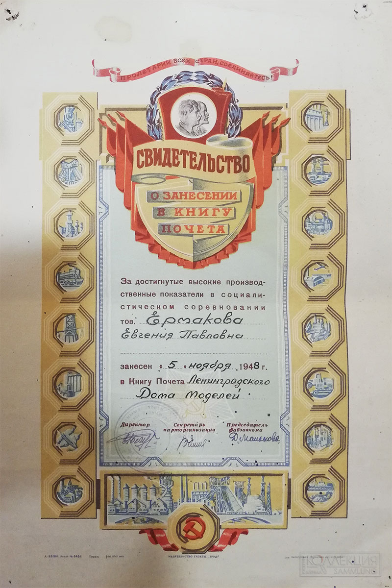 Свидетельство о занесении в книгу почёта 1948. Ленинградский дом моделей