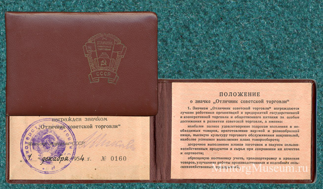 Удостоверение Отличника советской торговли СССР, 1954 год. К удостоверению -
