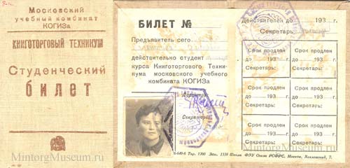 Студенческий билет Московского учебного комбината КОГИЗа (Книготорговое объединение государственных издательств), 1937 год