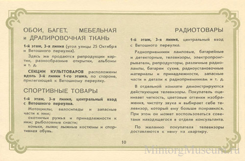 ГУМ. Информационный проспект. Первый информационный проспект ГУМа, открытого после ремонта в 1953 году. С 1918 года по начало 1953 года в здании ГУМа располагались разнообразные учреждения. Ремонт, о котором упомянуто выше, длился всего несколько месяцев: с августа по ноябрь! В течение недолгого времени были выявлены отдельные недостатки планировки, расположения магазинов и их количество. В течение года были осуществлены изменения, которые можно увидеть на информационном проспекте магазина, выпущенном в 1954 году. |