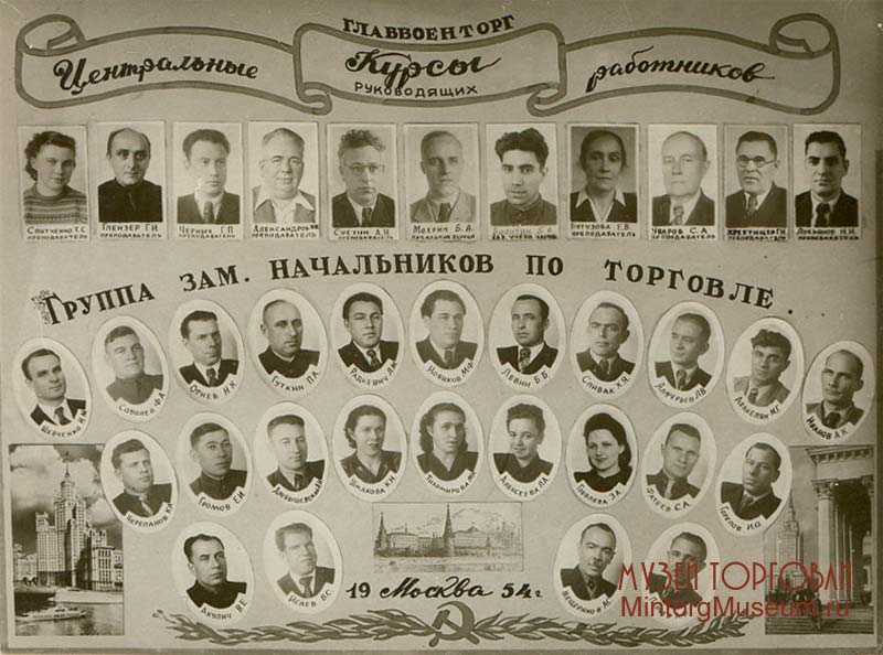 Главвоенторг. Центральные курсы руководящих работников. Группа заместителей начальников по торговле. Москва, 1954 г. Преподаватели: Спитченко Т.С. - преподаватель Глейзер Т.И. - преподаватель Черных Г.П. - преподаватель Александров М.М. - преподаватель Суетин А.Н. - преподаватель Мохрин Б.А. - начальник курса Болотин Б.А. - Заведующий учебной частью Бутузова Е.В. - преподаватель Уваров С.А. - преподаватель Хребтичев Г.И. - преподаватель Лукьянов Н.И. - преподаватель