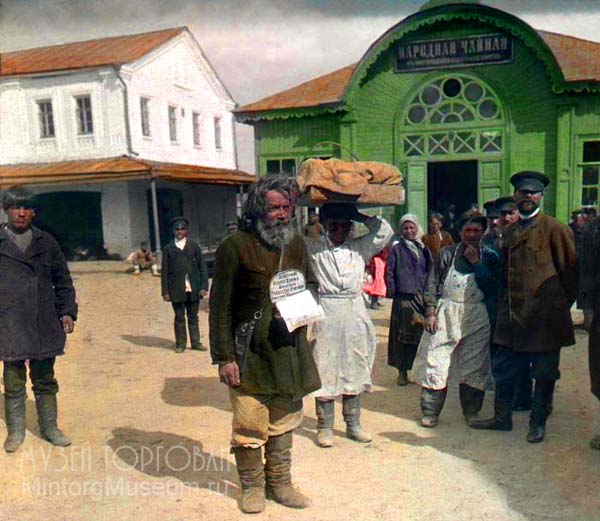 Вывеска "Народная чайная", 1896 год. Вывеска изготовлена из стального листа, крашенного чёрной красой, с выполнением изображения белой краской. Интересный персонаж с товаром на голове - привычное расположение при переносе в то время. Автор фотографии Франтишек Кратки |