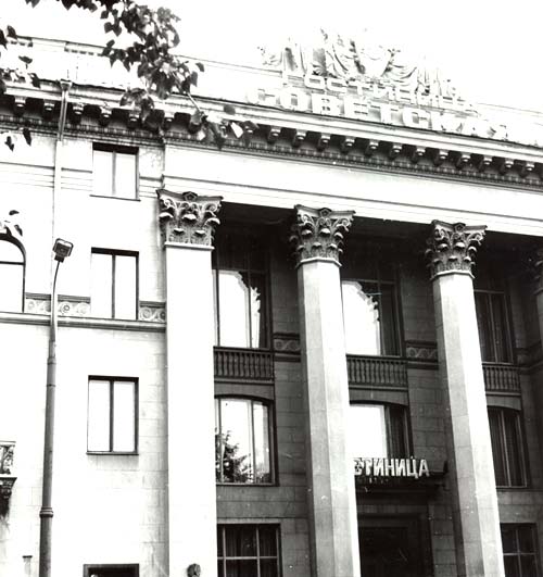 Вывеска на фронтоне. Гостиница "Советская" г. Москва Вывеска на фасаде здания. Вывеска в виде букв из газосветных трубок на жёсткой задней несущей части. Здесь вывеска на другой стороне здания (со стороны Ленинградского проспекта). |