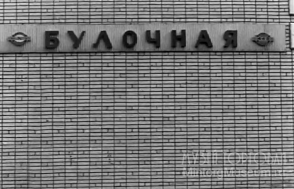 Вывеска "Булочная". Вывеска изготавлена из металлического уголка и гофрированного металлического листа, поверх которого расположены объёмные буквы без подсвета лицевых частей, отображающие наименование торгового предприятия. Элементы с боков от основногой надписи, указывают на номер булочной и её принадлежность.