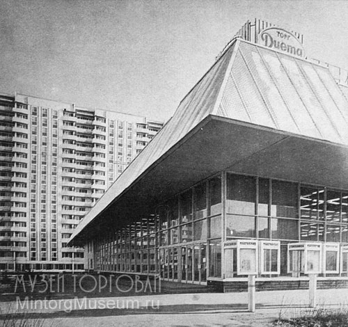 Универсальный магазин торга "Диета" г. Москва, 1984 год Осенний бульвар, 12, к. 1 На крыше стандартного здания установлена информационная конструкция с обозначением принадлежности магазина - торг "Диета". Здание универсама построено в 1984 году по типовому проекту по адресу Осенний бульвар 12 корп. 1. 29 марта 1987 года магазин посетила премьер-министр Великобритании Маргарет Тэтчер. В 1994 году здание приспособлено под супермаркет "Юникор". Изменена внешняя и внутренняя отделка. Экстерьер универсама приобрёл яркий желто-синий окрас. Внутри была сделана современная планировка и отделка. Магазин просуществовал до 1999 года. С 2000 года и по сей день в здании расположен универсам "Перекрёсток". С декабря 2007 года по сентябрь 2008 года магазин не работал и находился на реконструкции (замена кровельного покрытия и интерьера). Источник фото: Архитектура и строительство Москвы (№1, 1985) Денису Ромодину особая благодарность за фотоизображение! |