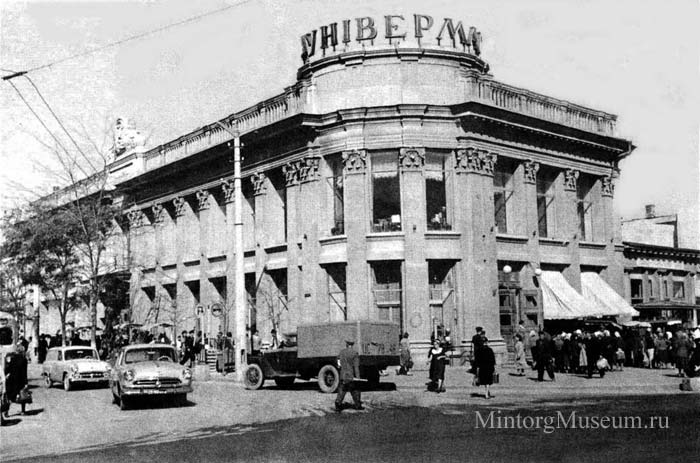 Фотография универмага г. Симферополь. До настоящего времени сохранился старый картуш "Главунивермаг" на фасаде здания. Представленная фотография взята с интереснейшего сайта А.В. Белова "Симферополь. Вчера и сегодня." |