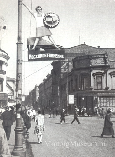 Рекламная установка типа панель-кронштейн на световой опоре московского предприятия "Мосхимобъединение" в начале 30-х годов ХХ века.