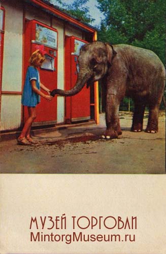 За красивой постановочной сценкой видны автоматы для продажи газированной воды. Москва, 1969 г.