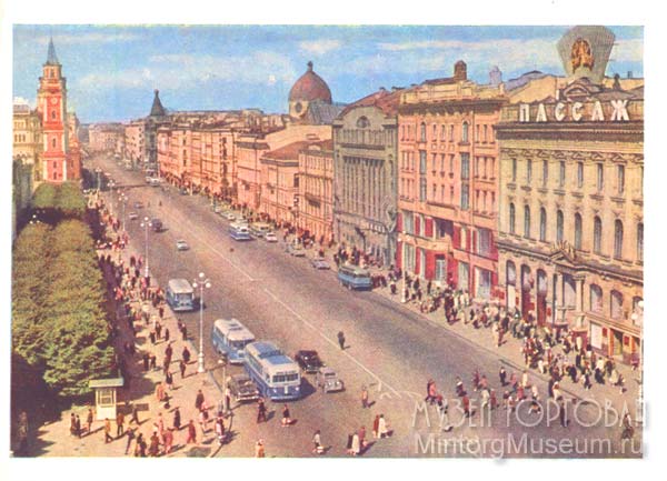 Магазин "Пассаж", г. Ленинград, 1963 год Красивая неоновая вывеска "ПАССАЖ" и товарный знак предприятия на крыше здания и вывеска на козырьке над входом |