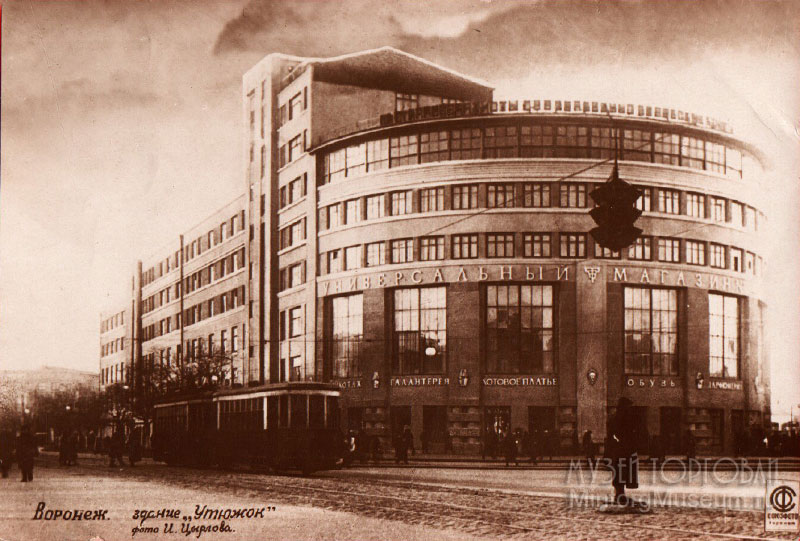 Универсальный магазин, г. Воронеж, 1945 г. Обратите внимание на дату. Воронеж сильно пострадал по время Отечественной войны от войск Германии и Венгрии, но на фото красивое большое здание, известное как "Утюжок" (фото И. Цырлова, почтовая карточка Союзфото, №9). Вывески Трикотаж, Галантерея, Готовое платье, Обувь, Парфюмерия. На крыше буквы не читаются... |