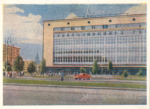 Универмаг "Москва" г. Москва Ленинский проспет, 54 Открыт в 1963 году. Основной асортимент: швейные изделия, трикотаж, обувь, парфюмерия, косметика, изделия из стекла, керамики и фарфора, сувениры и др. На 1-м этаже продовольственный отдел. Общая площадь семиэтажного здания 22 тысячи квадратных метров. Архитекторы Л.Н. Ляхов, Ю.С. Пересветов, О.А. Сергеева, В.А. Соболевский. Инженеры А.И. Рытов, Е.К. Фармаковская, М.К. Рябова). Площадь торговых залов 7 тысяч квадратных метров.. Товарооборот в 1979 году составил 326 миллионов рублей. В 1976 году коллектив универмага награжден орденом Трудового Красного знамени. Значок сотрудника универмага. |