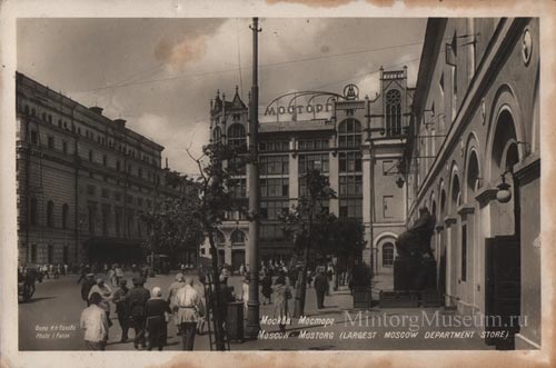 Редкое изображение. Знаменитой вывески ещё нет. "Мюр и Мерелиз", но еще и не ЦУМ - Мосторг. Магазин возник в 1908 г. как "Универсальный магазин Торгово-промышленного товарищества "Мюр и Мерилиз". После окт. 1917 г. вошел в структуру Московской потребительской кооперации. С 1921 г. находится в составе государственной торговли. Магазин № 1 "Москоммуна" (1918—1922) Универсальный магазин потребительской кооперации (МСПО) (1923—1932) Центральный универсальный магазин (ЦУМ) (1933—1952) Московский центральный универсальный магазин (1953— ) |