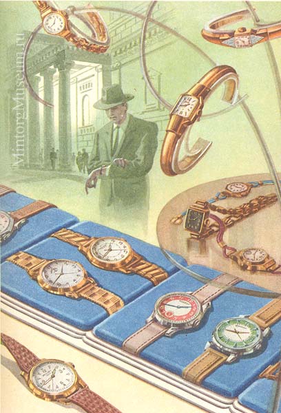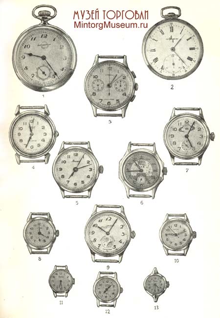 Часы механические карманные и наручные: 1 — карманные К-43 («Златоустовские»); 2 — карманные «Луч»; 3 - наручные мужские «Стрела» (с секундомером); 4 - наручные мужские «Родина»; 5 - наручные мужские «Волга»; 6 - наручные мужские «Дружба»; 7 - наручные мужские «Сатурн» (с календарным устройством); 8 - наручные женские «Комета»; 9 - наручные мужские «Спутник»; 10 - наручные женские «Весна»; 11 - наручные женские «Волга»; 12 - наручные женские «Эра»; 13 - наручные женские «Волга»