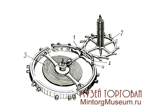 Анкерный палетный ход: 1 - палеты; 2 - анкерное колесо; 3 - баланс; 4 анкерная вилка