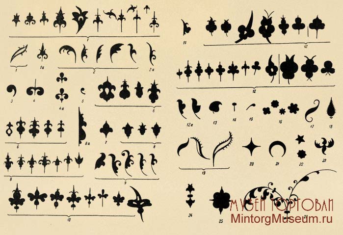 1 — истамбул-бикь; 1а — истамбул-бикь в соединении с вовла; 2 — половина истамбул-бикь; 2а — половина истамбул-бикь в соединении с вовла,- 3 — паранг-бикь; 4 — удвоенная франкская голова (кика паранг-бикь); 4а - удвоенная франкская голова в соединении с двойным чит; 5 — вовла-бикь; 6 — мучал-бикь; 6а — половина мучал-бикь; 7 — сулка-бикь; 8 — кацала-бикь; 9 — половина кацала-бикь; 10 — ашаком-бикь (или уцама-бикь); 11 — половина ашаком-бикь; 12 — гулгул-бикь; 12а — половина гулгул-бикь; 13 — гута-бикь; 14 — какие; 15 — чит; 16 — пархикуан; 17 — калькус; 18 — мицаля-капиля; 19 — сивай; сивай с волосками иногда трактуется как половина истамбул-бикь; 20 — огмуда; 21 — бацлясурат; 22 — дилясурат; 23 — сочетание гутабикь и двух половин истамбул-бикь; 24— сочетание какие, истамбул-бикь и сулка-бикь; 25 — тамга в виде "седельной подушки"; 26 — ветвь с "головками"