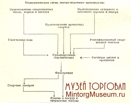 В СССР подкрашивание производилось естественными или пищевыми синтетическими красителями, в т. ч. колером, черникой, кошенилью, нафтолом жёлтым, индиго, амарантом. Колер, как краситель добавляют во все виды ликёро-водочных изделий , которые должны иметь светло-коричневый или коричневый цвет. Колер приготовляется из сахара путем нагрева при температуре 180— 200°. Лимонная кислота и красители применяются в виде водных растворов; и только некоторые красители не растворимы в воде и добавляются в виде водно-спиртовых растворов. Последовательность выполнения производственных операций приготовления ликёро-водочных изделий представлена на схеме.