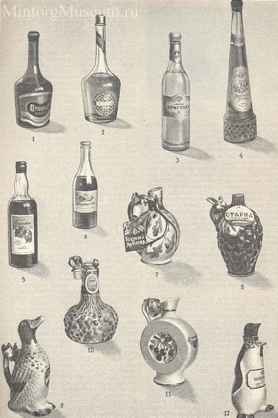 1, 2, 3 - ликёры в стеклянной упановке; 4 - настойка в оригинальной упаковке «Нежинская рябина»; 5, 6 - наливки и настойки в стеклянной упаковке; 7, 8 — настойки в фарфоровой упаковке; 9, 10, 11, 12 — ликёры в фарфоровой и фаянсовой упаковке