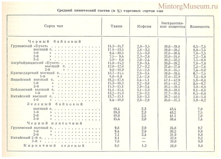 Возбуждающее действие чая зависит от содержащегося в нем кофеина. Благоприятно действуя на центральную нервную систему, главным образом на мозговые центры, чай повышает умственную активность, содействует правильной функции деятельности почек, а также улучшает пищеварение. Содержание кофеина (в % на сухое вещество) в свежем чайном листе изменяется в зависимости от сезона сбора, возраста листа: 1-й верхний лист 3,39; 2-й — 4,20; 3-й — 3,40, 4-й — 2,10, 5-й — 1,70; старые листья — 0,70; стебли — 0,36. Первые три листа побега используются на байховый чай, а нижние листья — для кирпичного чая. Содержание кофеина в чашке напитка байхового или плиточного чая и в чашке настоя кофе примерно равное, около. 0,05 г.