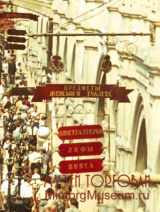 Организация торговли в ГУМе. Особенностями ГУМа, выделяющими его как крупнейшее, ведущее торговое предприятие страны, являлись: специализация торговли в секциях, широкое развитие и разработка новых форм торговли и методов работы с промышленностью по вопросам расширения ассортимента и улучшения качества товаров.