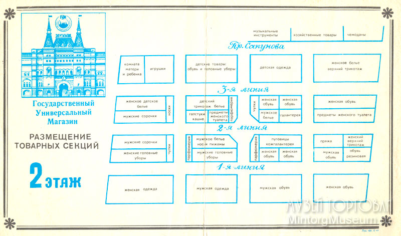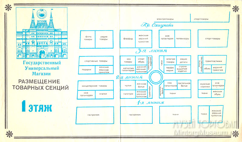 Информационный проспект отремонтированного ГУМа, подготовлен к открытию в 1953 году. Ремонт, о котором упомянуто выше, длился всего несколько месяцев: с августа по ноябрь! В течение недолгого времени были выявлены отдельные недостатки планировки, расположения магазинов и их количество. Поэтому были осуществлены изменения, которые можно увидеть на информационном проспекте магазина, выпущенном в 1954 году.