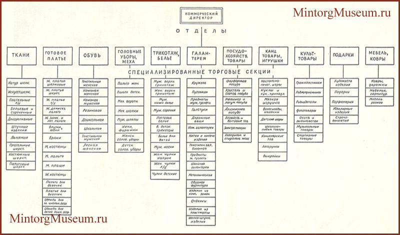 Общая структура аппарата ГУМа на середину 50-х годов. Вся торговая деятельность ГУМа была сосредоточена в 10 товарных отделах: 1) канцтоваров и игрушек, 2) текстильных товаров, 3) готового платья, 4) обуви, 5) трикотажно-бельевых товаров, 6) посудо-хозяйственных товаров, 7) головных уборов и мехов, 8) галантерейных товаров, 9) культтоваров, 10) подарков и ювелирно-парфюмерных товаров, 11 )мебель и ковры.