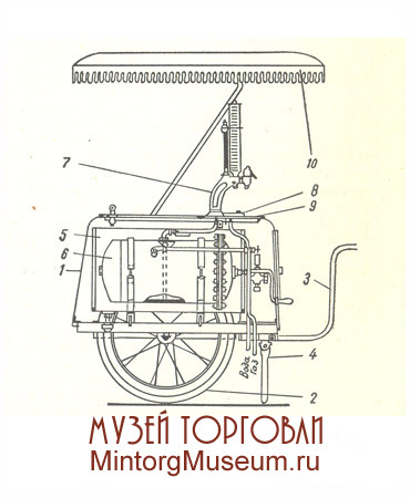 Тележка имела две ванны: в большой ванне монтировался сатуратор 5, в малую 6 укладывался лёд для охлаждения воды; раздаточная колонка 7 и стаканомойка 8 были расположены на неподвижной крышке стола 9. Сверху установливался тент 10 для защиты тележки от дождя и солнечных лучей.