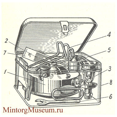 1 - резервуар; 2 - пробка для закупоривания резервуара при вывинчивании горелки; 3 - горелка (шумная) со штуцером и наливной чашкой; 4 - съёмные ножки; 5 - дозировочная банка для денатурата; 6 - ключ монтажа горелки; 7 - трёхстворчатая ветровая шторка; 8 - футляр с откидной крышкой