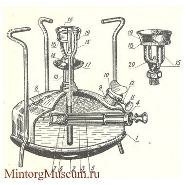 1 - резервуар; 2 - днище; 3 - трубка насоса; 4 - крышка насоса; 5 - шток насоса; 6 - гайка насоса; 7 - кожаный манжет насоса; 8 - клапан насоса; 9 - корпус наливного люка; 10 - крышка наливного люка; 11 - воздушный винт; 12 - трубка воздушного винта; 13 - штуцер; 14 - гайка горелки; 15 - трубчатая часть горелки; 16 - испарительная камера; 17 - чашечка; 18 - упорное кольцо; 19 - отражатель; 20 - форсунка (капсюль, ниппель)