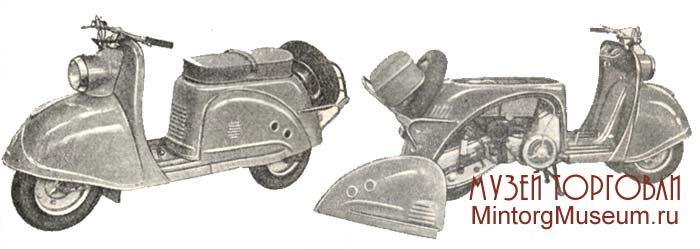 Мотороллер широко известной в стране марки в новом варианте должен быть стать еще более популярным. Ведь теперь на нём могли совершать деловые, туристические поездки, загородные прогулки не два, как раньше, а три человека. Испытания показали, что, несмотря на сравнительно низкую мощность двигателя (8 л. с.), эксплуатация мотороллера с боковым прицепом возможна и на горных дорогах.