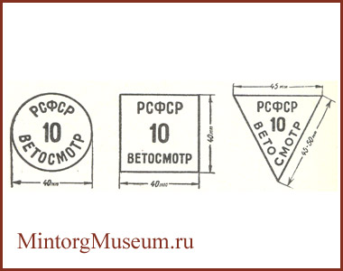 Клейма определённой формы и размеров удостоверяли доброкачественность и категорию упитанности мяса. На каждом клейме должно было быть вырезано "Ветосмотр", номер предприятия, где произведена проверка мяса, а также наименование республики, на территории которой находилось предприятие. Клеймо для мяса I категории имело круглую форму, для мяса II категории - квадратную, тощего мяса - треугольную форму. Клеймо круглой формы имело в диаметре 40 мм, сторона квадратного клейма 40 мм и сторона треугольного клейма 45 мм.