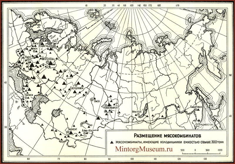 Размещение мясокомбинатов, имеющих холодильники ёмкостью свыше 300 тонн, в СССР в 1958 году