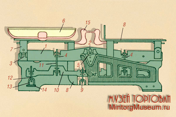 Весы настольные обыкновенные состоят из равноплечевого коромысла 1 с пятью призмами, из них средняя 2 является опорной, две концевые, 3 - грузоприёмными и две соединительными 4. Призмы 2 и 3 проходят сквозь тело коромысла и наглухо закреплены в нём. Коромысло опирается на подушки 5, помещённые в станине весов. Чашки (площадки) 6 расположены над коромыслом на крестовинах, которые опираются с одной стороны через скобы 7 на грузоприёмные призмы, а с другой стороны при помощи ног 8 на серьги 9 рычагов 10. Рычаги эти связаны с коромыслом при помощи соединительных призм 11. Каждый рычаг имеет по три призмы: одна, крайняя, является опрорной, вторая грузоприёмной (воспринимающей нагрузки от ноги 8), а средняя соединительной. Опорные призмы рычагов связаны при помощи серёг 12 с неподвижными ушками 13, которые прикреплены к планкам 14, соединяющим боковые стенки станины весов. Серьги 11 и 12 опираются на призмы через подушки. Для определения равновесия служат указатели 15, расположенные один против другого.