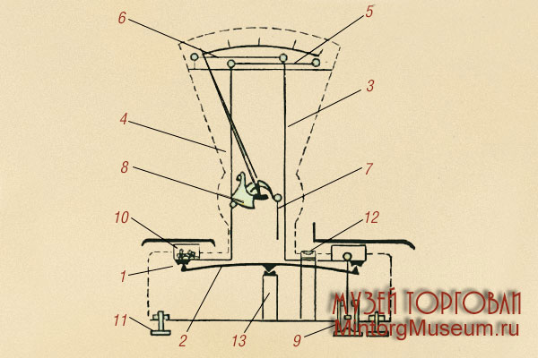 Весы настольные циферблатные. В отличии от весов обыкновенных, основным отсчётным механизмом служат циферблаты и указательные стрелки. Весы имеют два циферблата: один расположен на стороне, обращённой к продавцу, другой - на стороне, обращённой к покупателю. Обе указательные стрелки жёстко соединены между собой и перемещаются по циферблатам под действием нагрузки. Шкала циферблата имеет различные деления. Устройство циферблатных весов с двум площадками видно из схемы. Площадки весов упираются на грузоприёмные призмы 1 сдвоенного равноплечего основного рычага 2 и с другой стороны на ноги 3 и 4, удерживаемые струнками 5 и 6. Нога 3 при помощи тяги 7 соединена с квадрантом (противовесом) 8, к которому прикреплены указательные стрелки циферблата. Под грузоприёмной площадкой помещается успокоитель 9. Он представляет собой поршень, который, передвигаясь в цилиндре, наполненном маслом, замедляет движение стрелки и сокращает количество её колебаний. Тормозящее действие успокоителя регулируется с помощью цилиндра, который ввинчивается в его гнездо. Под гиревой площадкой имеется тарировочная камера 10, в которую насыпается балласт при регулировке ненагруженных весов для приведения их в равновесие. Такая регулировка называется тарированием. Винтовые ножки 11 служат для горизонтальной установки весов. О правильности установки судят по уровню 12, прикреплённому к корпусу. Основной рычаг упирается на подушки, расположенные на стойке 13. Механизм весов заключён в металлический кожух, имеющий застеклённые окна в местах расположения шкалы. При подготовке весов к перевозке все призмы выводятся из соприкосновения с подушками с помощью специального изолирующего винта (стопора). Под площадками имеются две надевающиеся одна на другую муфты, предохраняющие механизм весов от загрязнения.