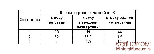 Разделка говяжьих туш и сортировка мяса. Туши, полутуши и четвертины говядины в розничной торговле разделялись на части (отрубы). Каждая полутуша разделывалась на девять частей, которые в зависимости от морфологического и химимеского состава, питательной ценности и кулинарного назначения делятся на три торговых сорта: 1-й, 2-й и 3-й.