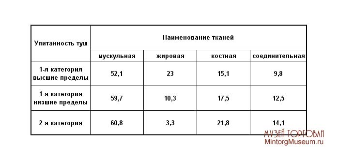 Соотношение тканей (в %) в говяжьей туше разных категорий упитанности