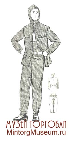 Массовый спортивный костюм для стрелкового спорта состоял из куртки (блузы) и брюк. Куртка имела отложной воротник с прямым горловым разрезом на молнии, вшивные рукава с манжетой на одной пуговице, перед и спинку с кокеткой; по поясу была продёрнута в подрубной шов эластичная резиновая тесьма шириной 18—20 мм. Брюки с гульфиком, с поясом на одной пуговице, с двумя карманами в боковых швах, низки имели отвороты. Изготовлялись из х.-б. замши или вельветона. Выпускались с № 44 по № 56 (ТУ 1834—56). Спортивный костюм летний для стендовой стрельбы состоял из пиджака и брюк. Пиджак был сделан на подкладке, без воротника, застёгивается левой полой на три пуговицы, полы имели подборта с прокладками, боковые накладные карманы, на правой поле в верхней части имелась кожаная накладка, спинка в верхней части с двух сторон имела по складке. Рукав вшивной с разрезом внизу и с застёжкой на три пуговицы, в верхней части правого рукава кожаная накладка. Брюки с гульфиком, пояс застёгивался на одну пуговицу, имел по бокам застёжки, края низа с отворотами. Изготовлялись эти спортивные костюмы из коверкота, костюмного трико; подкладка из сатина и саржи. Выпускались с № 44 по № 54 (ТУ 1703-54).